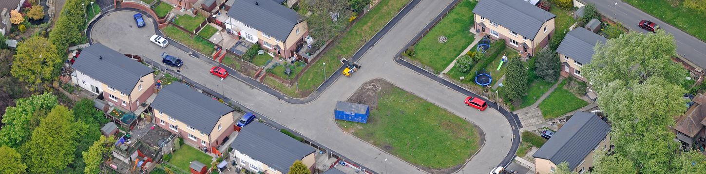 aerial view of residential area local authority Metrotile lightweight roofing charcoal