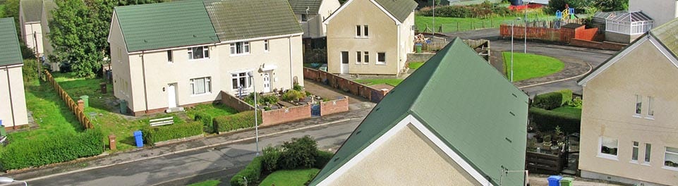 Local Authority Homes in Glasgow with Metrotile Lightweight Roofing Bond Green