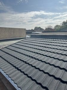 Above: A close up section of the new, lightweight durable roof in the Metrotile Charcoal Bond tile.