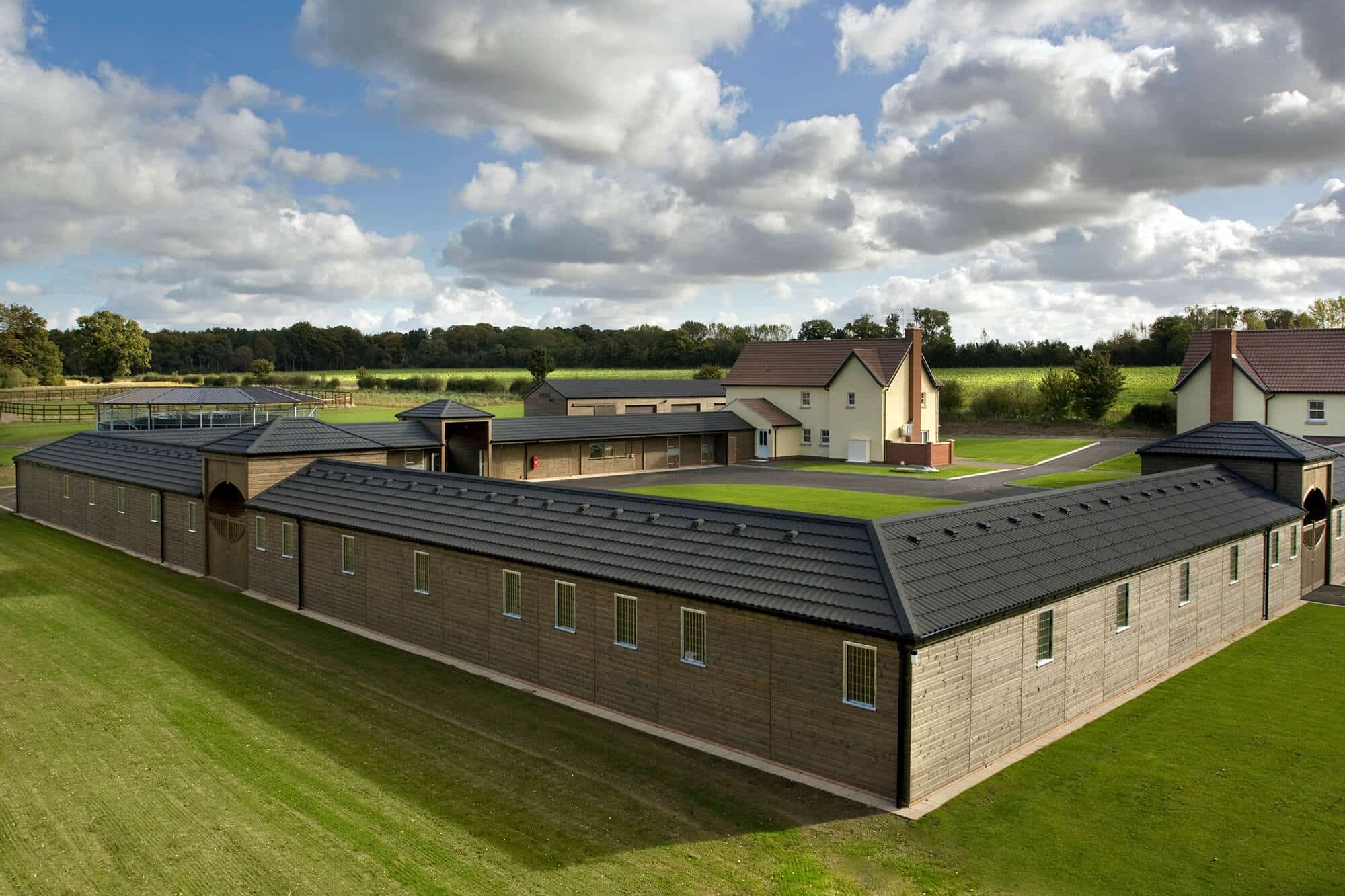 PGL Liddington Timber Frame Accommodation with Metrotile Lightweight Roofing in Bond Charcoal with retrofit Photovoltaic System
